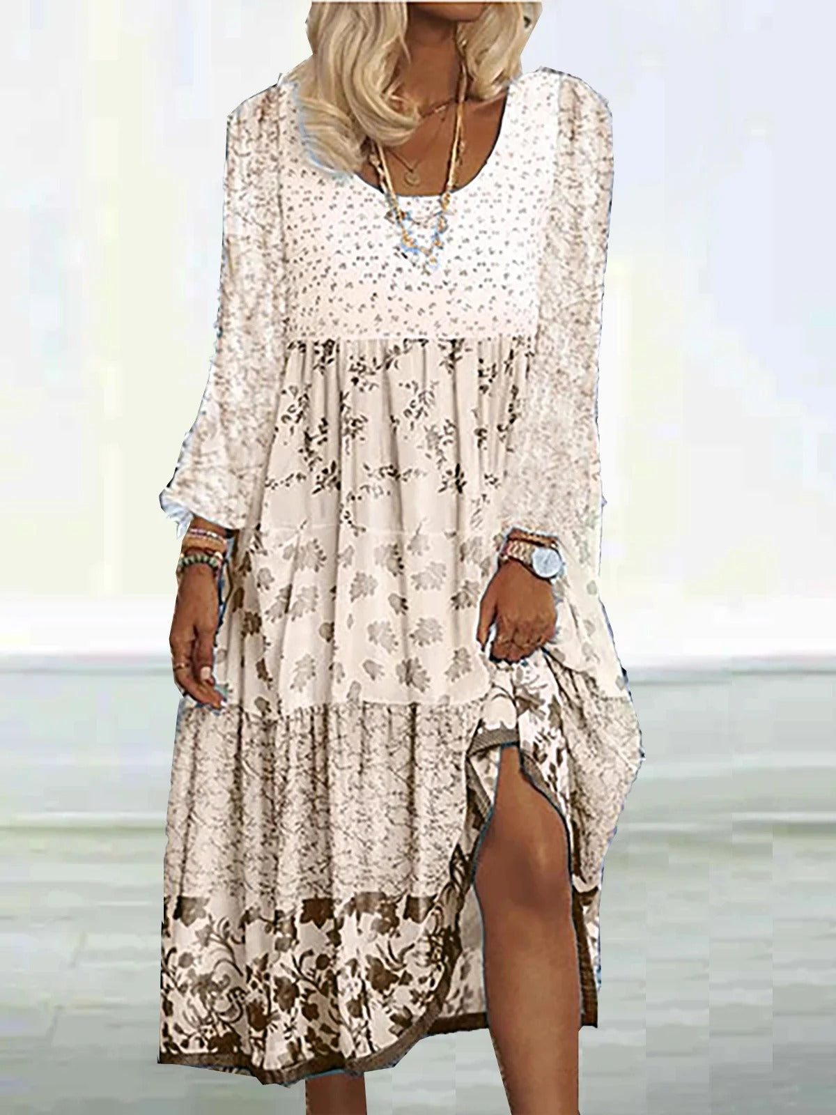 Stijlvolle Boho-jurk met Bloemenmotief en O-hals